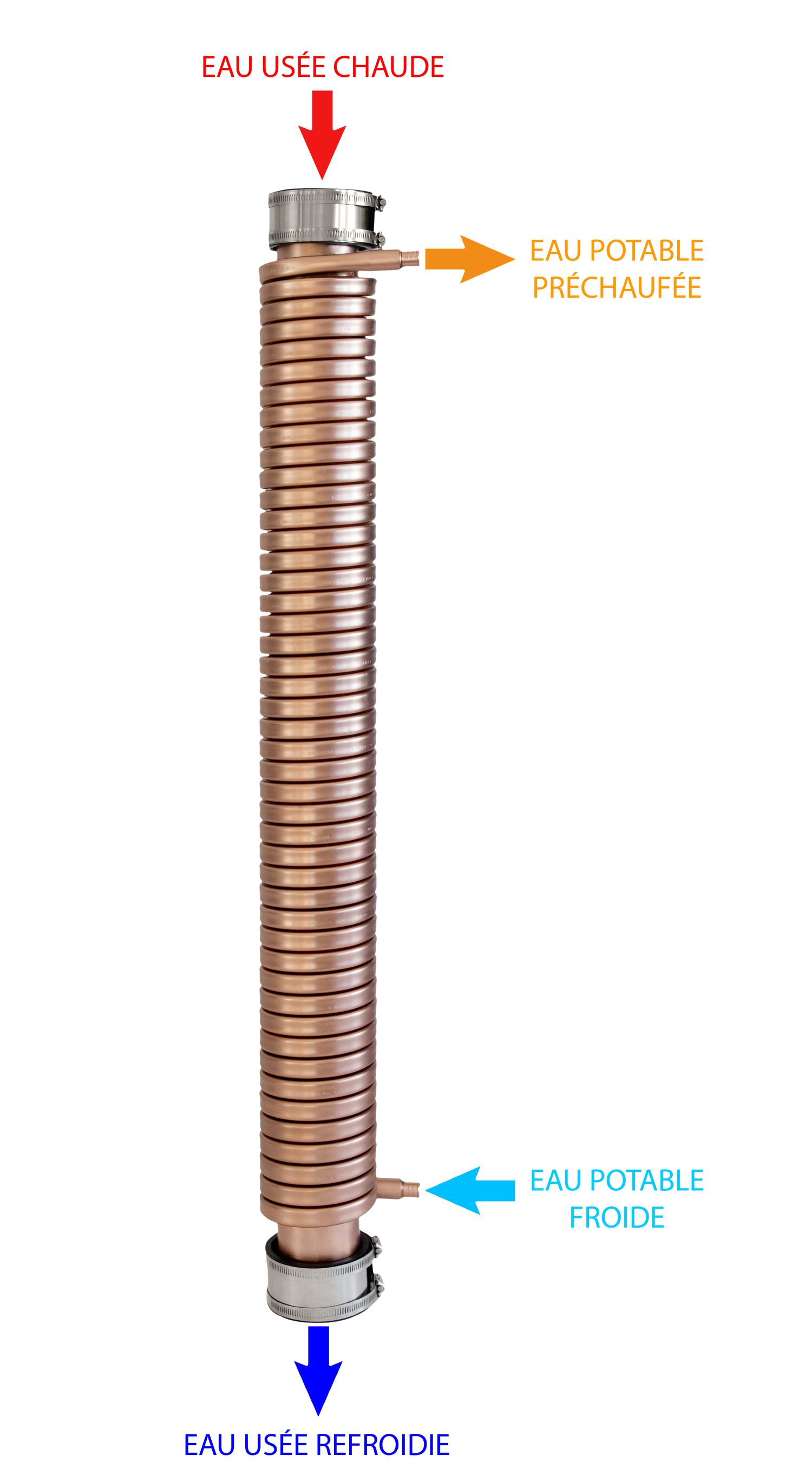 Le système ThermoDrain de récupération de la chaleur des eaux grises (RCEG) est composé d’une section du tuyau de drainage en cuivre autour duquel est enroulé un serpentin de cuivre. Quand l’eau chaude est évacuée par le tuyau de drainage, un transfert de chaleur s’effectue qui a pour effet de préchauffer l’eau circulant dans le serpentin. Cette eau préchauffée peut alors atteindre 18 degrés Celsius (32 degrés F) avant de se retrouver à l’intérieur du chauffe-eau.